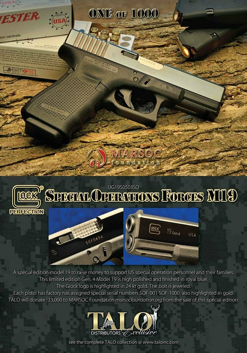 Serial #1 of the TALO Glock G19 Special Ops is up for auction to help raise funds for the Marine Raider Foundation. All proceeds from the sale will go to the Marine Raider Foundation. This rare custom Glock is being donated by Robert Coyle, TALO’s previous Executive Director, from his private collection. If able, please consider bidding to help a great cause!